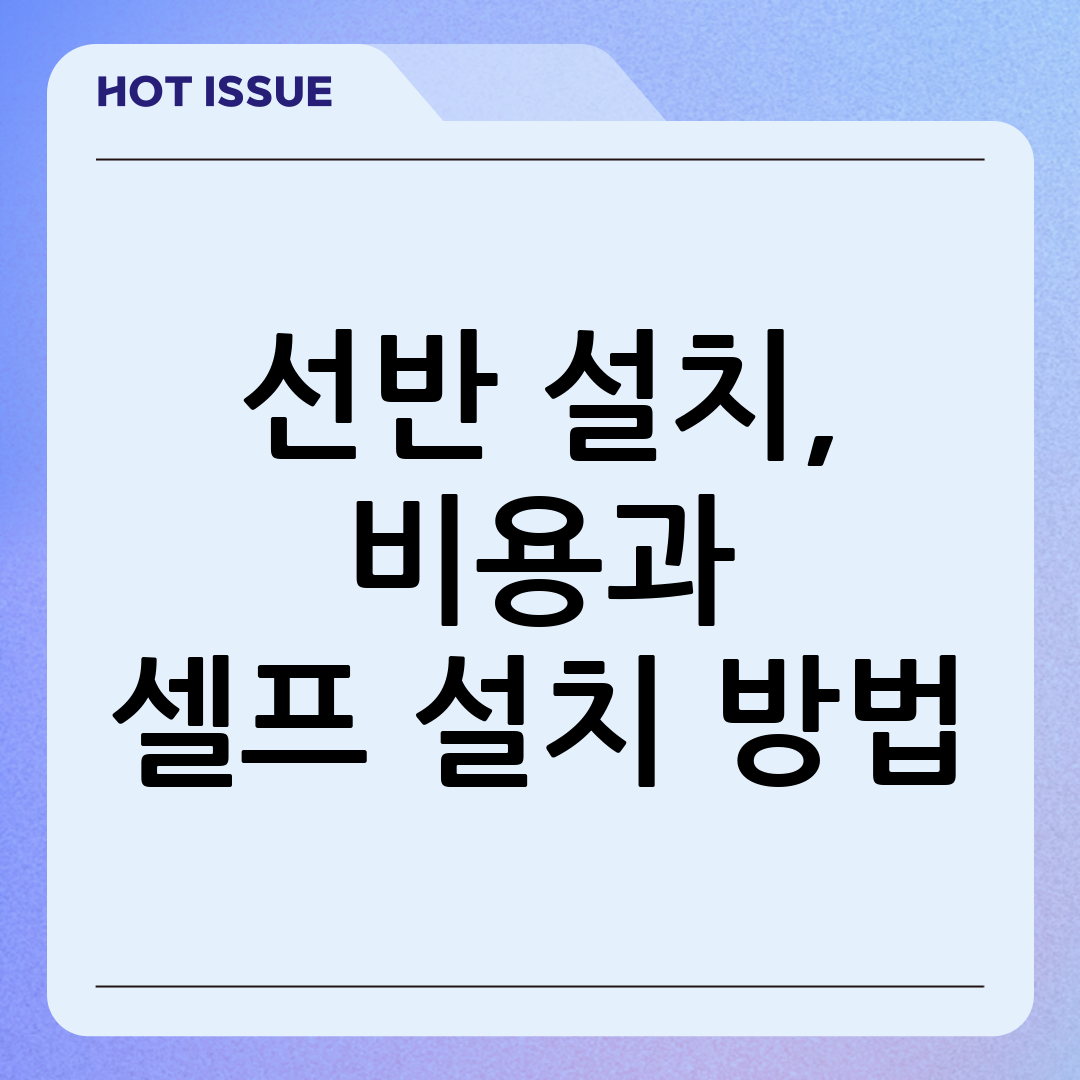 셀프 설치 비용은 선반 구매 비용과 필요한 공구 비용으로 구성됩니다. 선반 구매 비용은 선반의 종류, 크기, 소재에 따라 다르며, 필요한 공구는 드라이버, 드릴, 수평계, 줄자 등이 있습니다. 만약 집에 공구가 없다면, 공구 대여 서비스를 이용하거나 저렴한 공구 세트를 구매하는 것을 고려해 볼 수 있습니다.