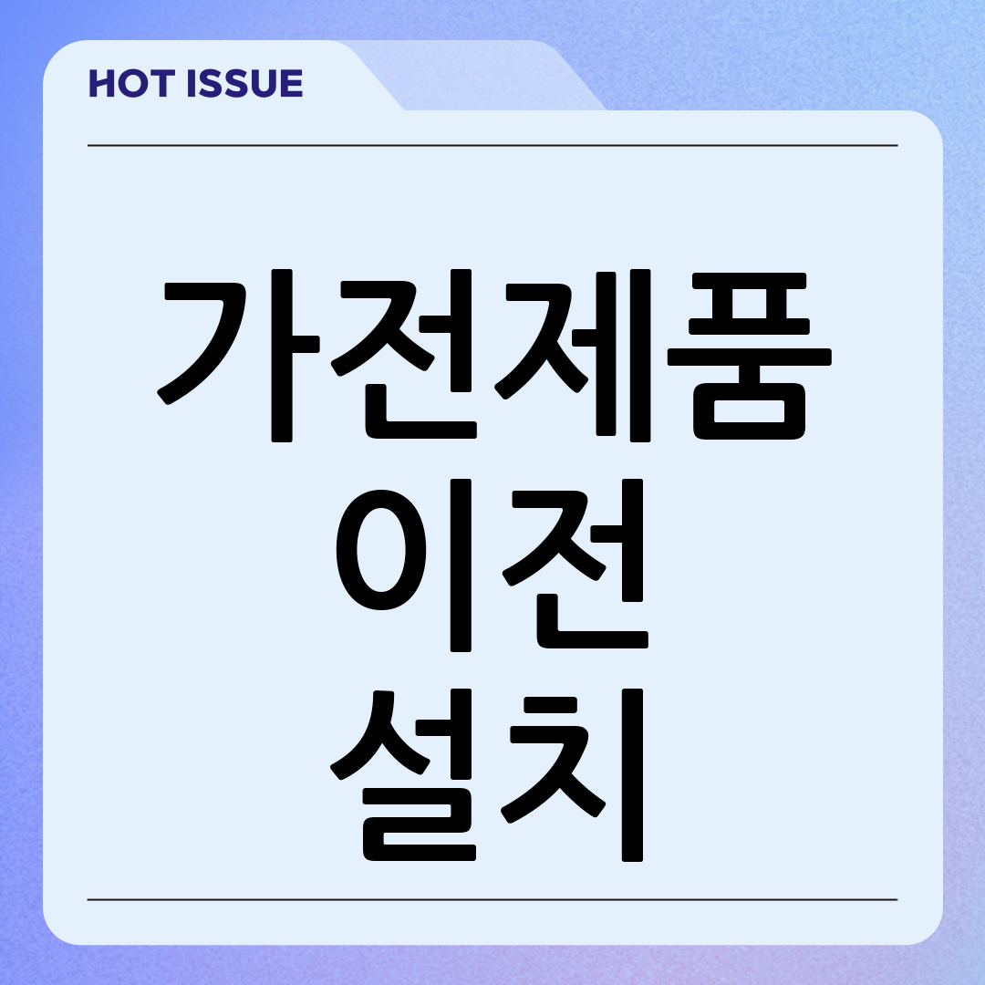 가전제품 이전 설치는 이사 과정에서 중요한 부분입니다. 안전과 비용을 고려하여 합리적인 선택을 하는 것이 중요합니다. 이 글에서 제공한 정보를 바탕으로, 꼼꼼하게 준비하고, 신뢰할 수 있는 업체를 선택하여 안전하고 편리한 이사를 하시길 바랍니다. 가전제품 이전 설치, 이제 더 이상 어렵게 생각하지 마세요!